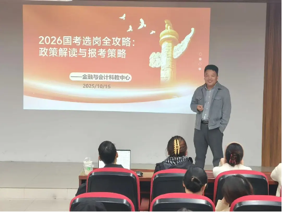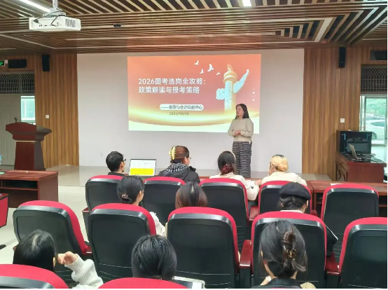随后,岳鹏超老师开始主讲。他围绕国考报名与备考,依次展开六个方面的内容讲解。首先是报考政策核心解读,岳老师详细剖析了国考报考的各项政策规定,包括报考条件、岗位要求等,让同学们对国考报考有了清晰的政策认知。接着,他分享了科学选岗策略制定的方法,结合金融和财会专业的特点,指导同学们如何根据自身情况,筛选出合适的岗位,提高报考的针对性与成功率。