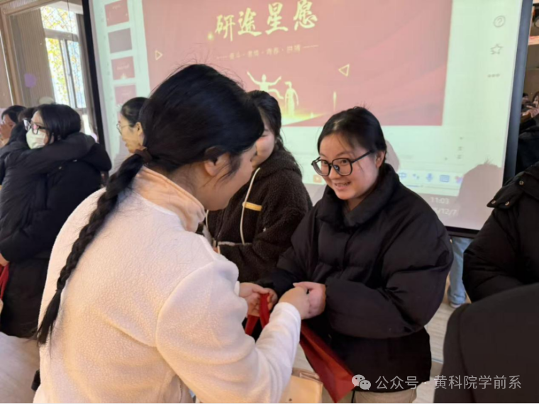 学前教育系党支部书记张丽红手持向日葵登台致辞。金黄花瓣寓意"一举夺魁",话语里却不止吉祥,更有体认与承诺:"你们只管乘风破浪,学院永远是你们的压舱石。"这份承诺,在孙惠利主任温柔诵读"研途心愿"卡片时得到回响。卡片上的梦想被郑重念出,如同在集体中激活了个体的意义。
