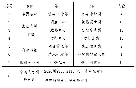 本次计划公开招聘共7个岗位和1项卓越人才计划,合计60人。具体岗位信息详见《郑州热力集团有限公司2025年度公开招聘岗位信息表》(附件1)。