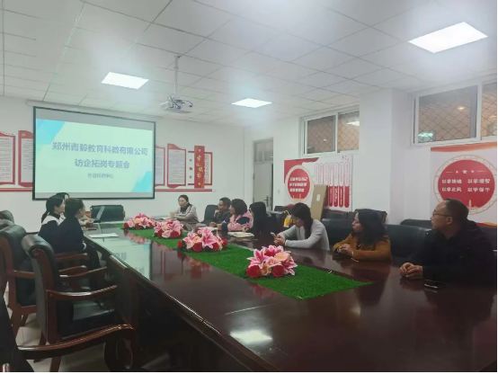 为深化校企协同育人机制,精准对接少儿绘本领域人才需求,优化人才培养方案,11月3日下午在商学部110会议室举办访企拓岗专题座谈会。郑州青毅教育科教中心老师荆博丹等和商学部主任贾和平、副主任宋海英、外语学管中心主任张倩、英语专业负责人张玲,任课教师王芳、聂宝钰,辅导员黄闪闪、王洪剑参加了此次座谈。
