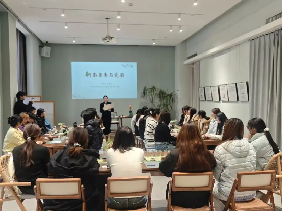 踏入科普基地,原木茶席与青白玉瓷相映成景,文化展板铺展河南茶瓷千年文脉——从信阳茶山晨雾到钧窑千年窑火,从唐宋风雅茶事到当代文化传承,古雅气韵让学子们驻足细赏、轻声交流,指尖触碰温润瓷面,体悟中原文脉厚重。活动期间,校企双方围绕茶文化对外传播需求、外语人才实践场景搭建等议题展开交流,基地负责人贾红丽老师详细介绍了茶文化科普、跨文化交流活动策划等相关岗位的实践要求,为学子们提供了外语应用与文化传播相结合的就业新思路。
