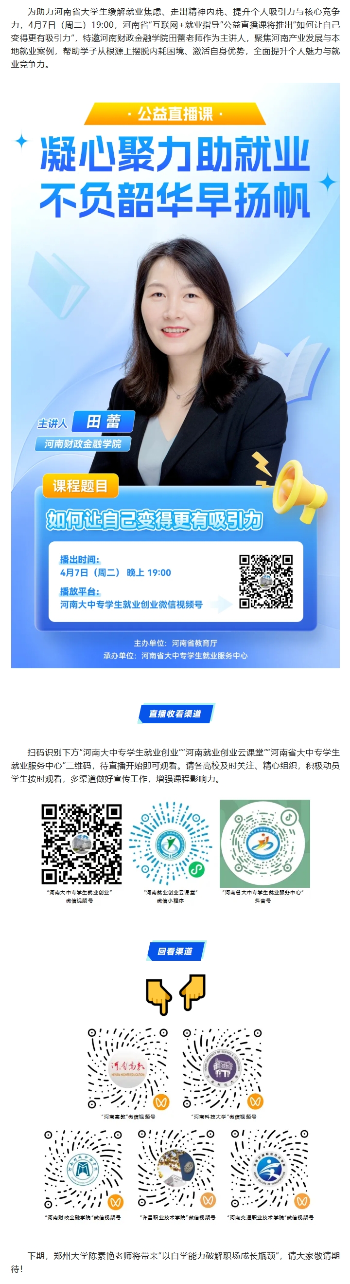 周二晚19:00,河南省“互联网+就业指导”公益直播课:如何让自己变得更有吸引力