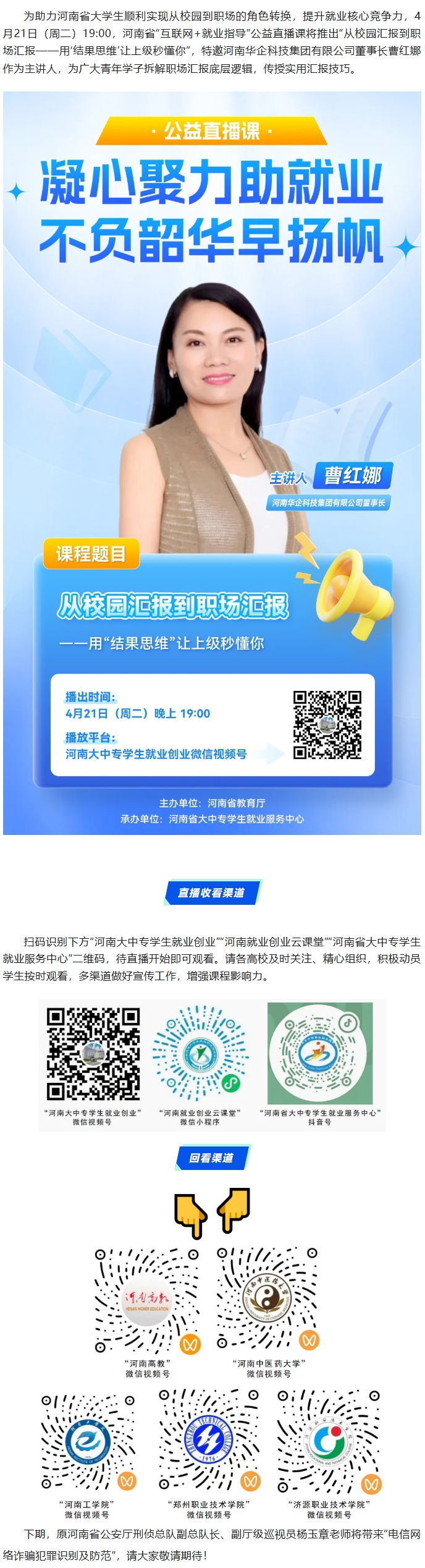 周二晚19:00,河南省“互联网+就业指导”公益直播课:从校园汇报到职场汇报——用“结果思维”让上级秒懂你
