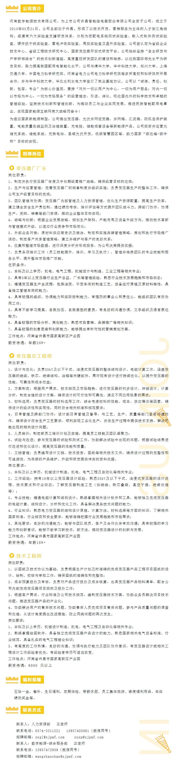河南数字能源技术有限公司变压器厂招聘简章